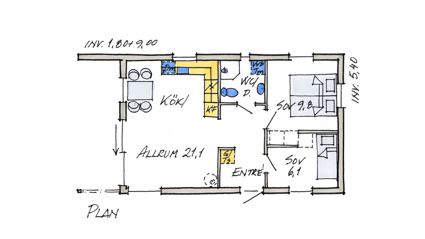 Nedanstående planlösningar är endast exempel. Alla våra hus är arkitektritade och anpassade efter era önskemål. Kontakta oss så berättar vi mer.