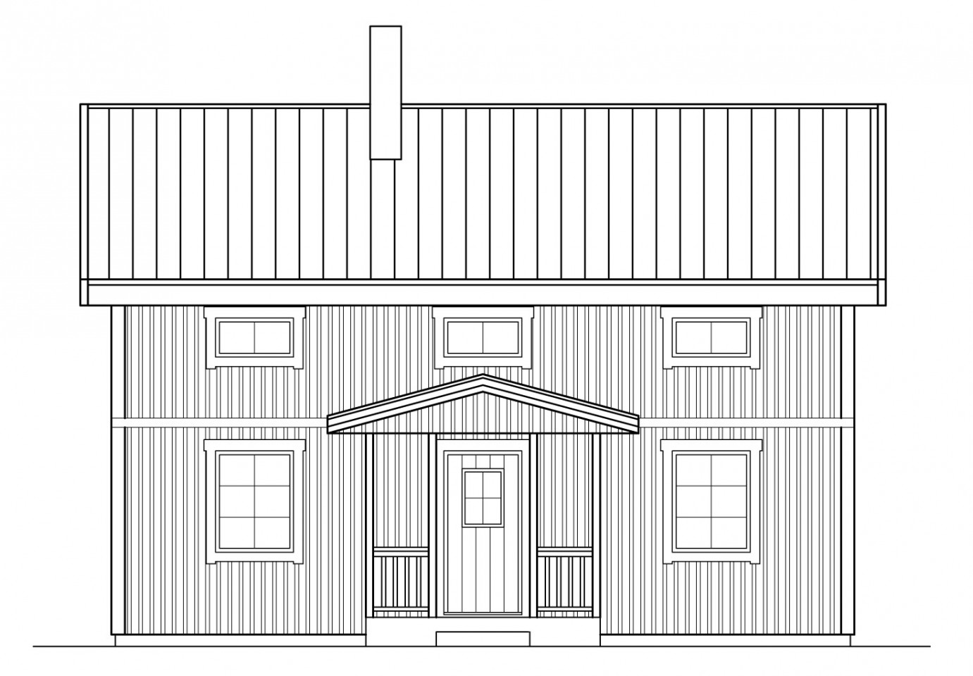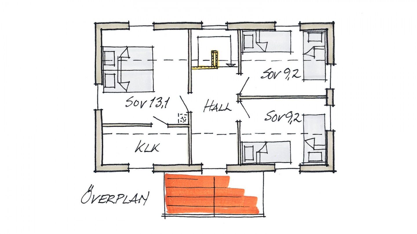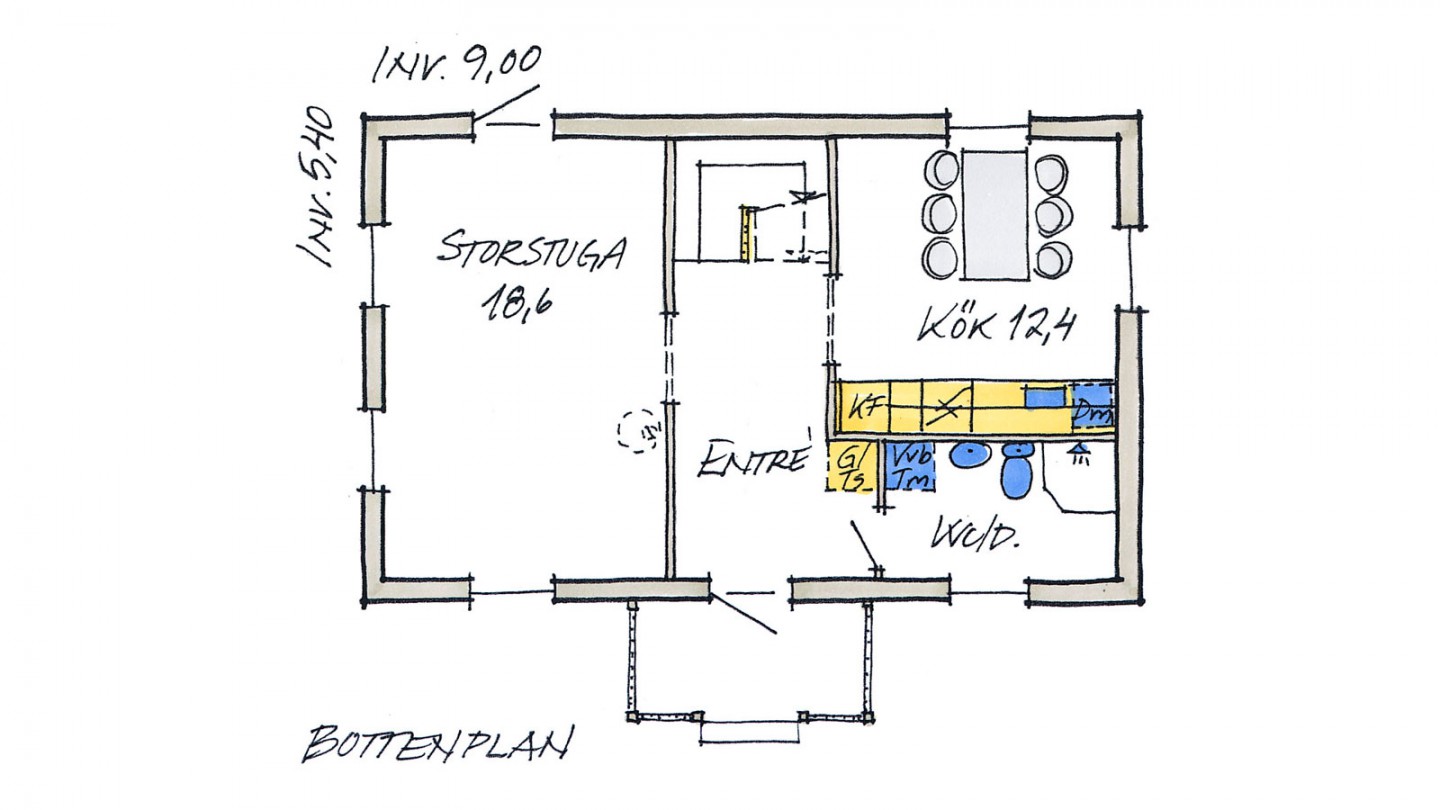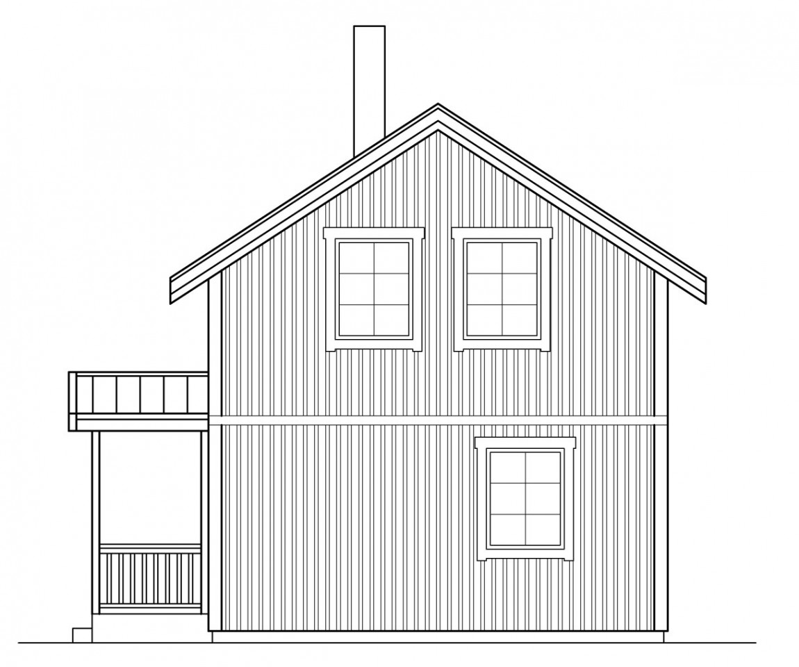 Ett rymligt hus väl förankrad i svensk träbyggnadstradition, med förstukvist och halvfönster under takfoten.