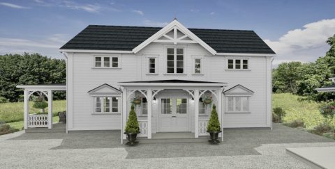 Denna villa är i två plan. På plan 1 kommer du in genom huvudentrén till en hall där det finns förvaring på båda sidor om dörren. Ut från hallen välkomnas du av en öppen planlösning med kök, matplats och vardagrum. Vardagsrumsdelen är i full nockhöjd och ger en pampig känsla med de två höga föstren på var sin sida om den öppna spisen. Intill det stora huvudrummet finns en groventre med extra plats för förvaring samt teknik. På ritningarna har jag placerat teknikrummet i ett tilltänkt garage, men om man önskar ha teknikrummet i huset får vi låna yta från groventrén.
