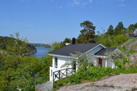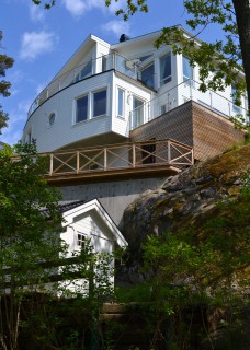 Arkitekt Endre har lyckats lösa att lägga in ett hus för familjen på den ”omöjliga” tomten med 25 meters nivåskillnad och med fantastisk utsikt. Balkongen som ger uteplats på taket och den böjda väggen ger karaktär åt huset.