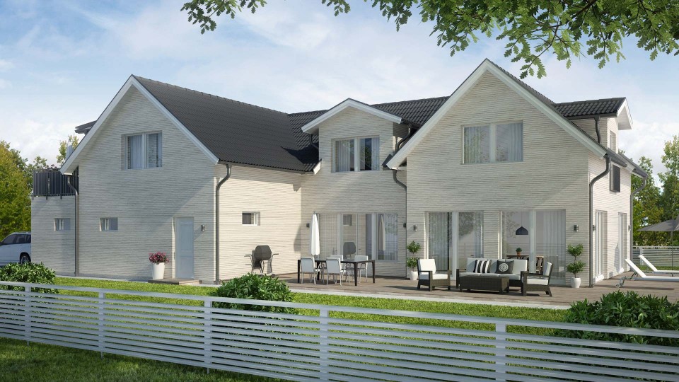Första huset är entré, gästrum, bastudel och klädvård. Garage och förråd är inbyggt i huset.
