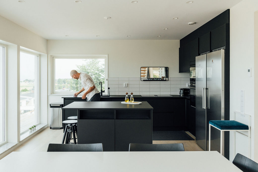 Det svarta köket skapar en effektfull kontrast mot de ljusa väggarna och golvet – en av de största trenderna 2025.