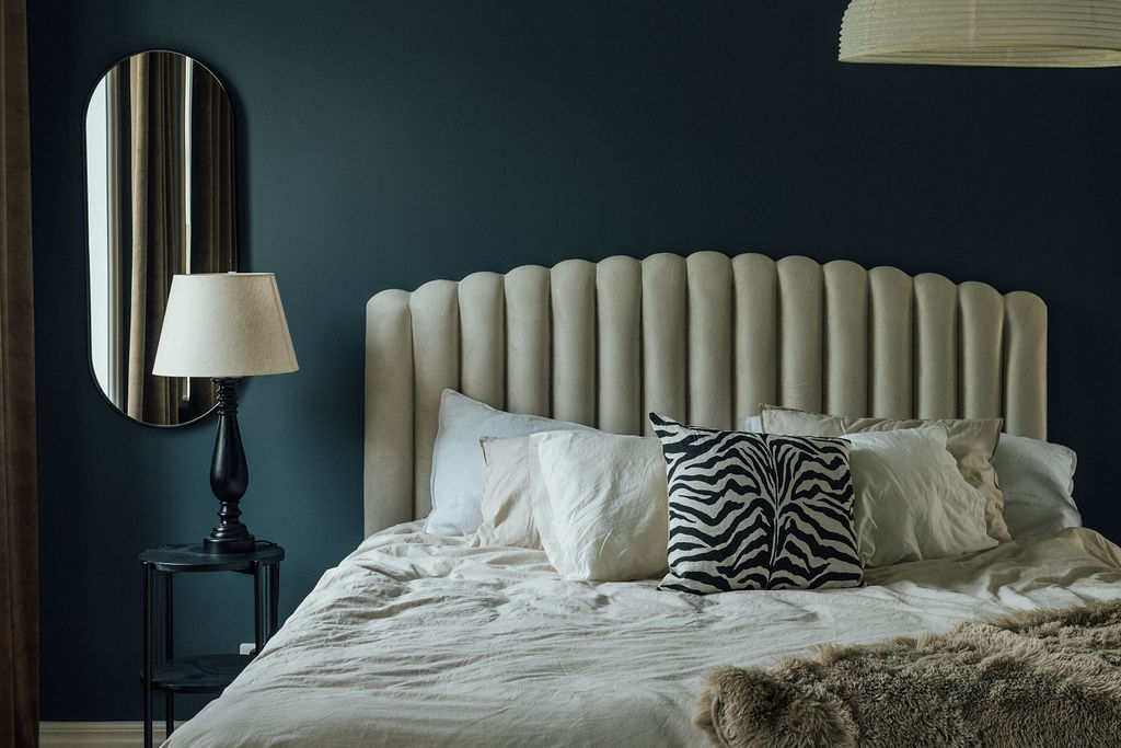 Ett mörkblått sovrum som utstrålar lugn och harmoni. Den djupa kulören skapar en ombonad känsla och förvandlar rummet till en rogivande oas.