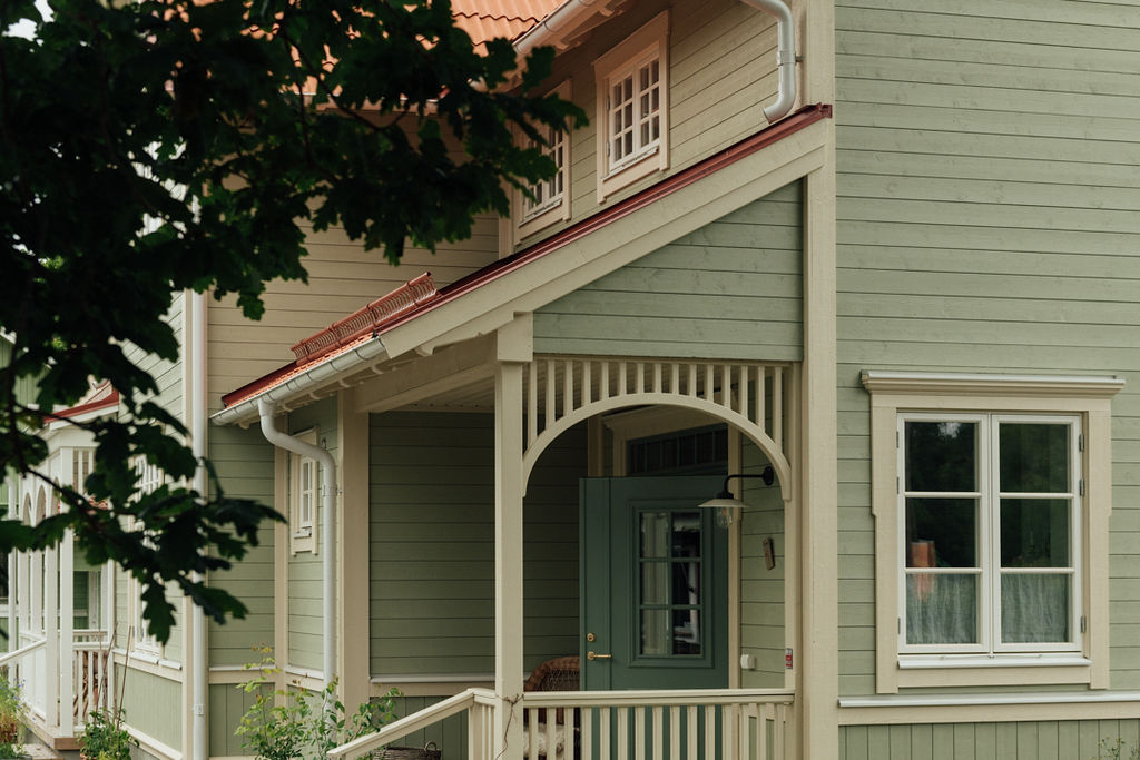 En diskret huvudkulör kan kombineras med en accentfärg på dörrar, fönsterfoder och detaljer för att lyfta husets karaktär utan överdrift. En entrédörr i en stark färg kan ge stilkänsla utan att dominera.